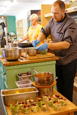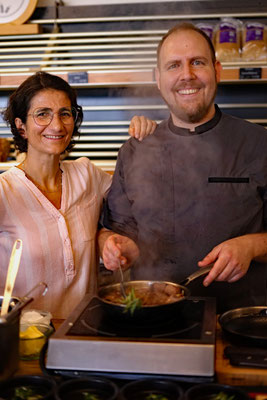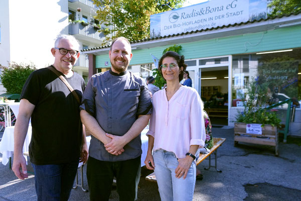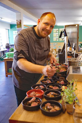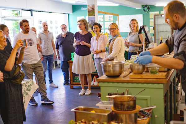 Es war ein gelungener Nachmittag für Feinschmecker. Martin verwendete Obst und Gemüse von unseren bio-regionalen Lieferbetrieben Böhm, Heitzer, Schweiger und Deinhart, Emmerkorn vom Aunkhofer für das Emmer sin Carne, Kirschessig vom Kriegl, Senföl vom Hoferbauer, Käse vom Michlbauer und Wohlfahrt, Rotwild vom Hofinger und viele weitere feine regionale Zutaten. Zum Abschluss gönnten sich die Gäste ein Eis vom Riepl. "Es war fantastisch", "so einfach und doch so lecker", "der Hammer", es wurden buchstäblich alle Erwartungen übertroffen, wie man in so kurzer Zeit auf so kleinem Raum für so viele Menschen so unglaublich gut kochen kann.